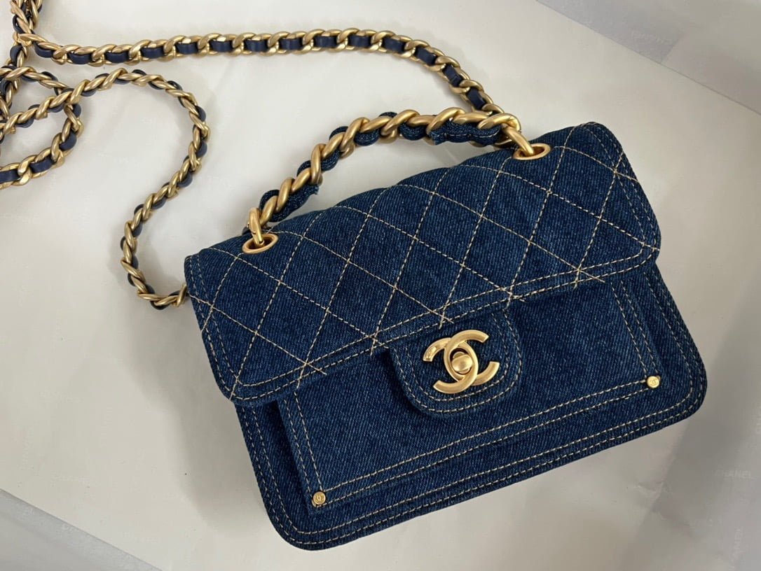 chanel spot 23s denim retro postman mouth cover bag as4051 Chanel denim tofu bag was amazed by this bag ✨ decorated with thick gold chain portable with gold retro hardware with denim retro sense directly filled 〰️ medieval design sense full of fragrant soul ~ nice ???????? hardware: Full copper ???????????? vintage gold size: 14*19*6cm