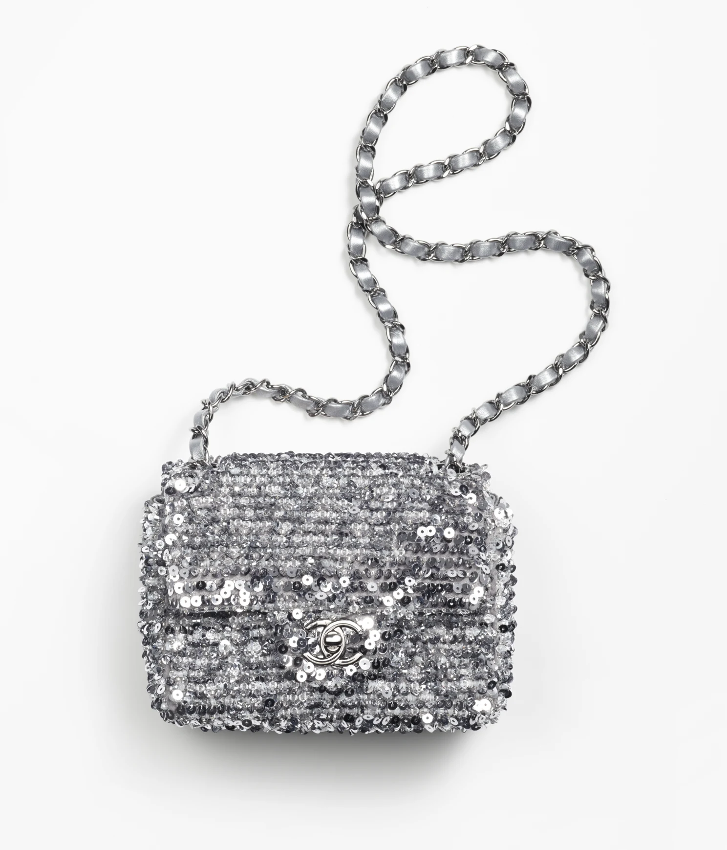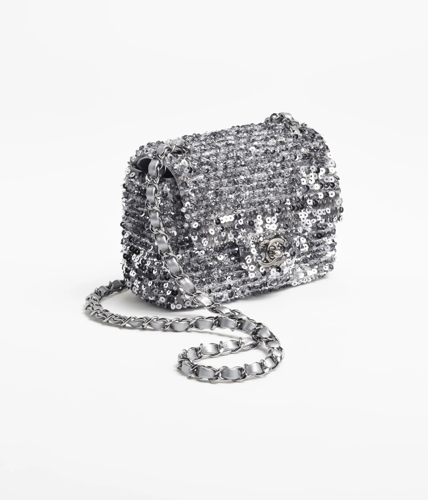 CHANEL / MINI FLAP BAG Embroidered Satin, Sequins, Glass Pearls & Ruthenium-Finish Metal Ref. AS4269 B13685 NQ843 Silver