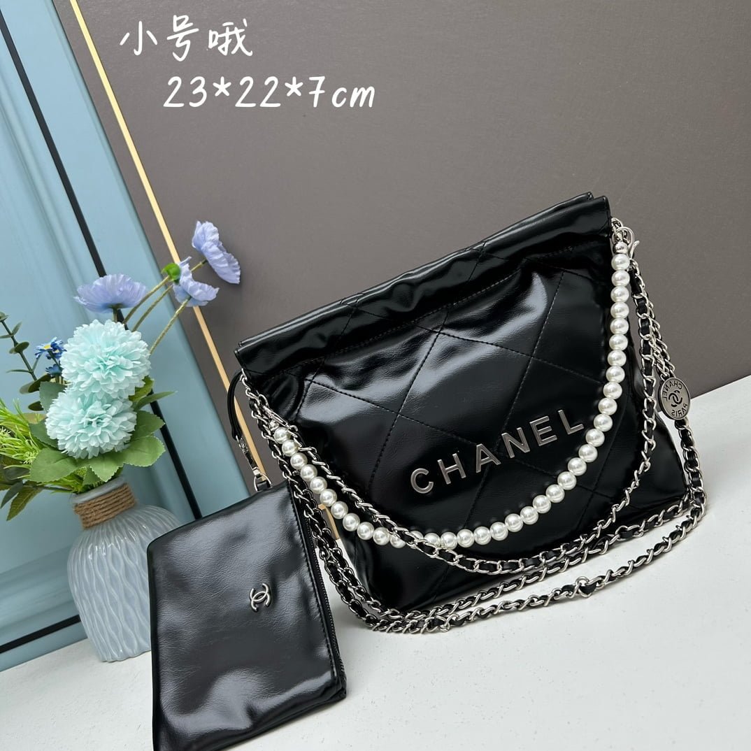 CHANEL Pearl garbage bag black with sliver hardware size: 23*28*22*7cm