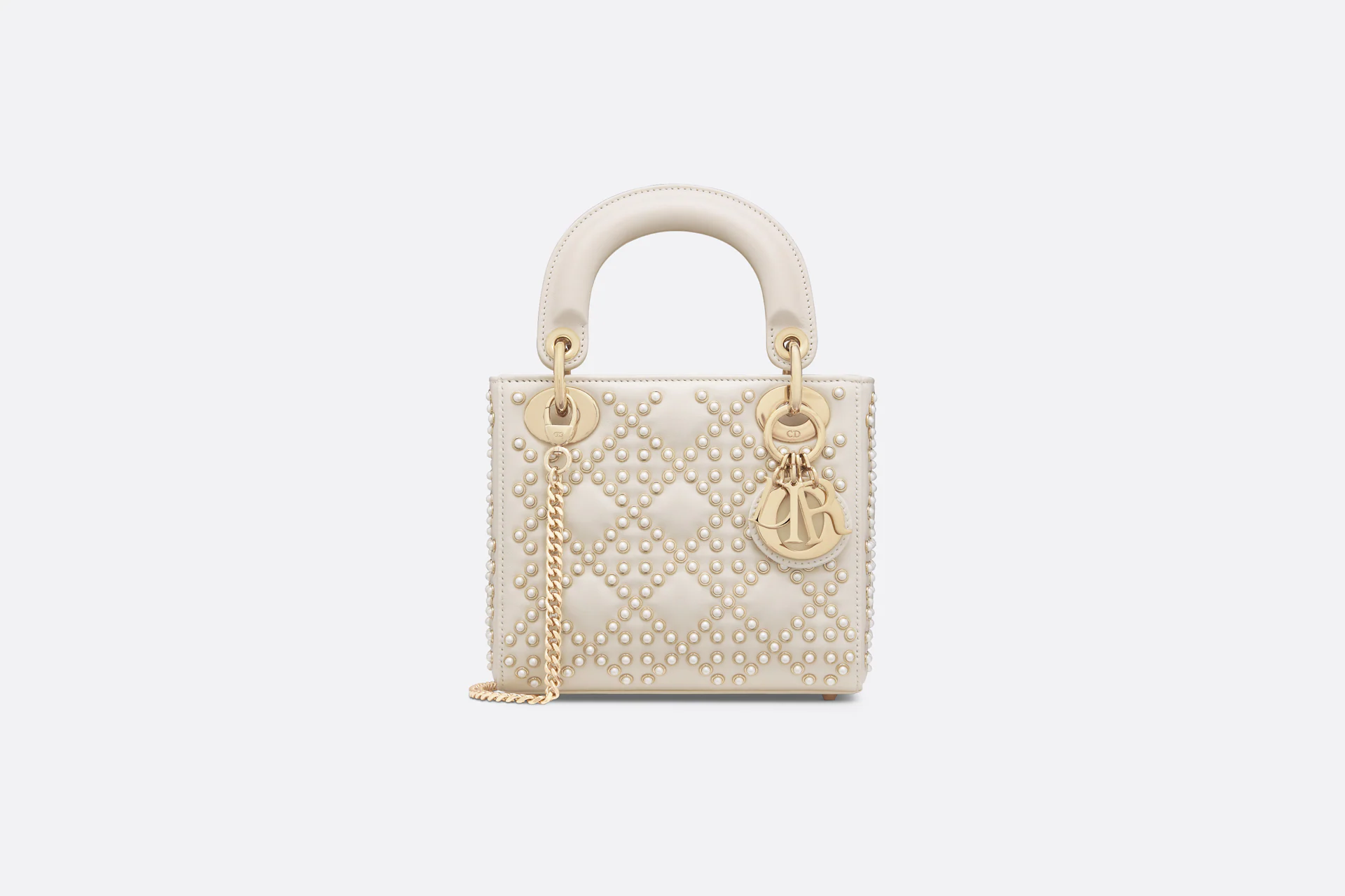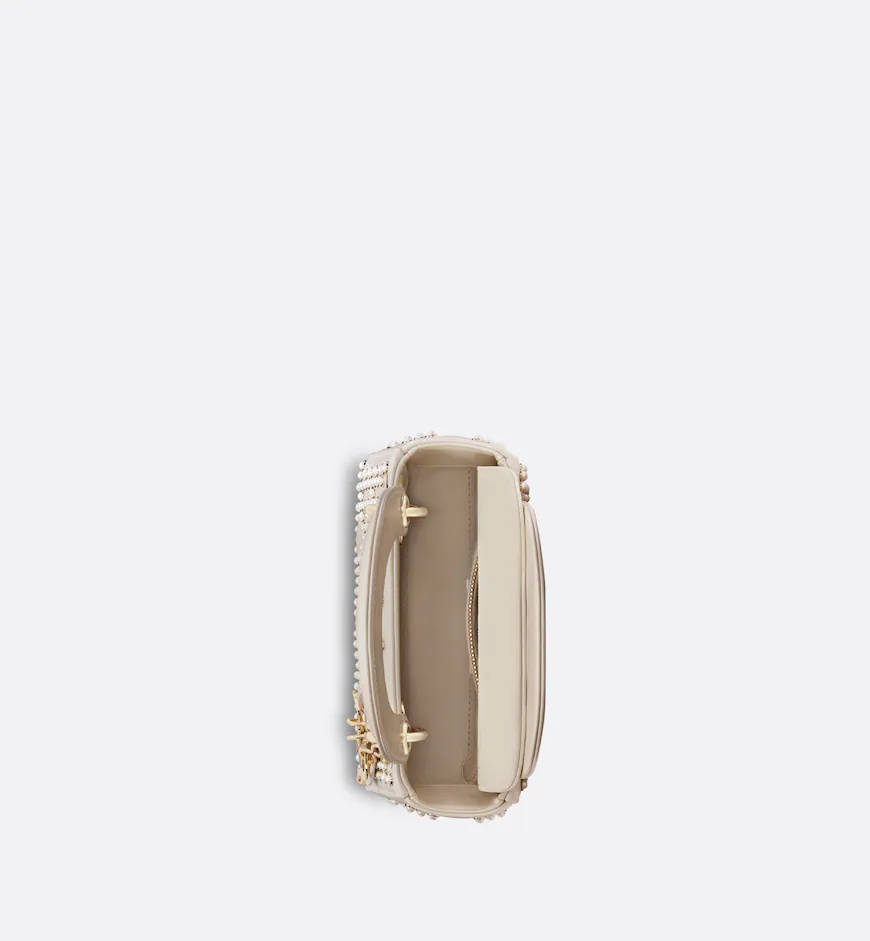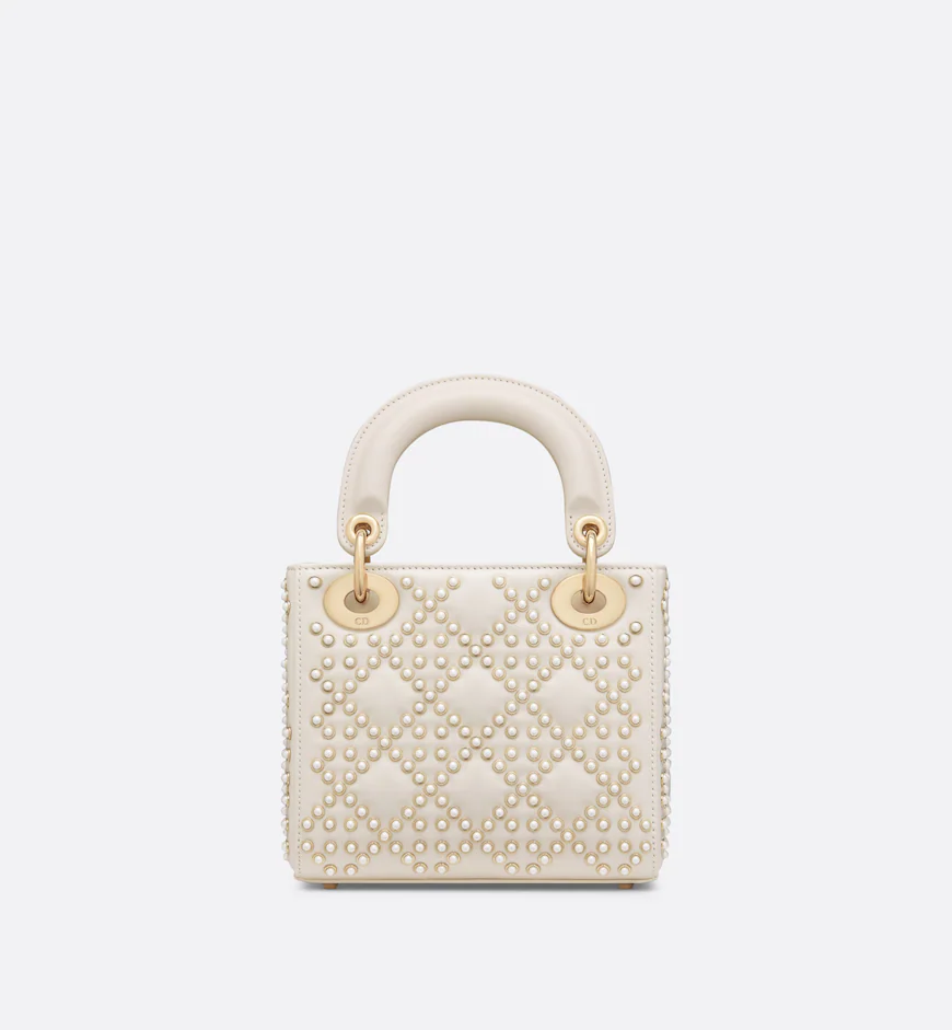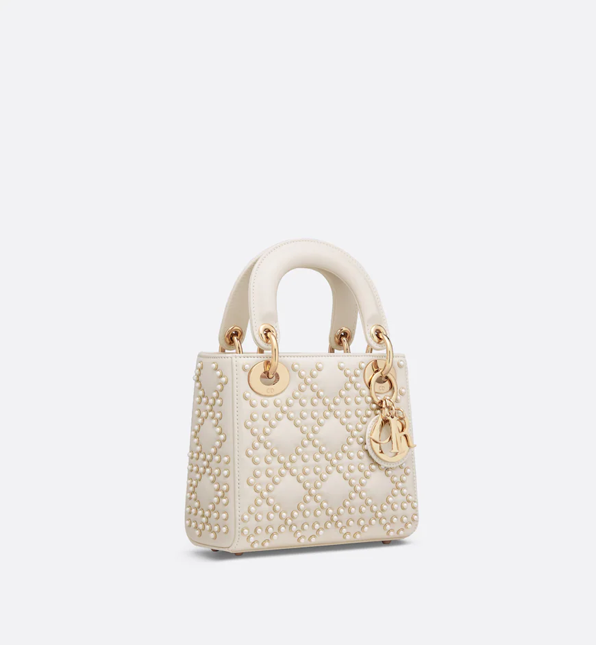 The Lady Dior bag embodies the House’s vision of elegance and beauty. Sleek and refined, the style is timeless. Crafted in latte lambskin with a crinkled effect, it is adorned with white resin half-pearls and rivets displaying the Cannage motif. Pale gold-finish metal D.I.O.R. charms further embellish its silhouette. Featuring a removable chain strap, the miniature Lady Dior bag can be carried by hand or worn crossbody as an ideal evening wear companion.