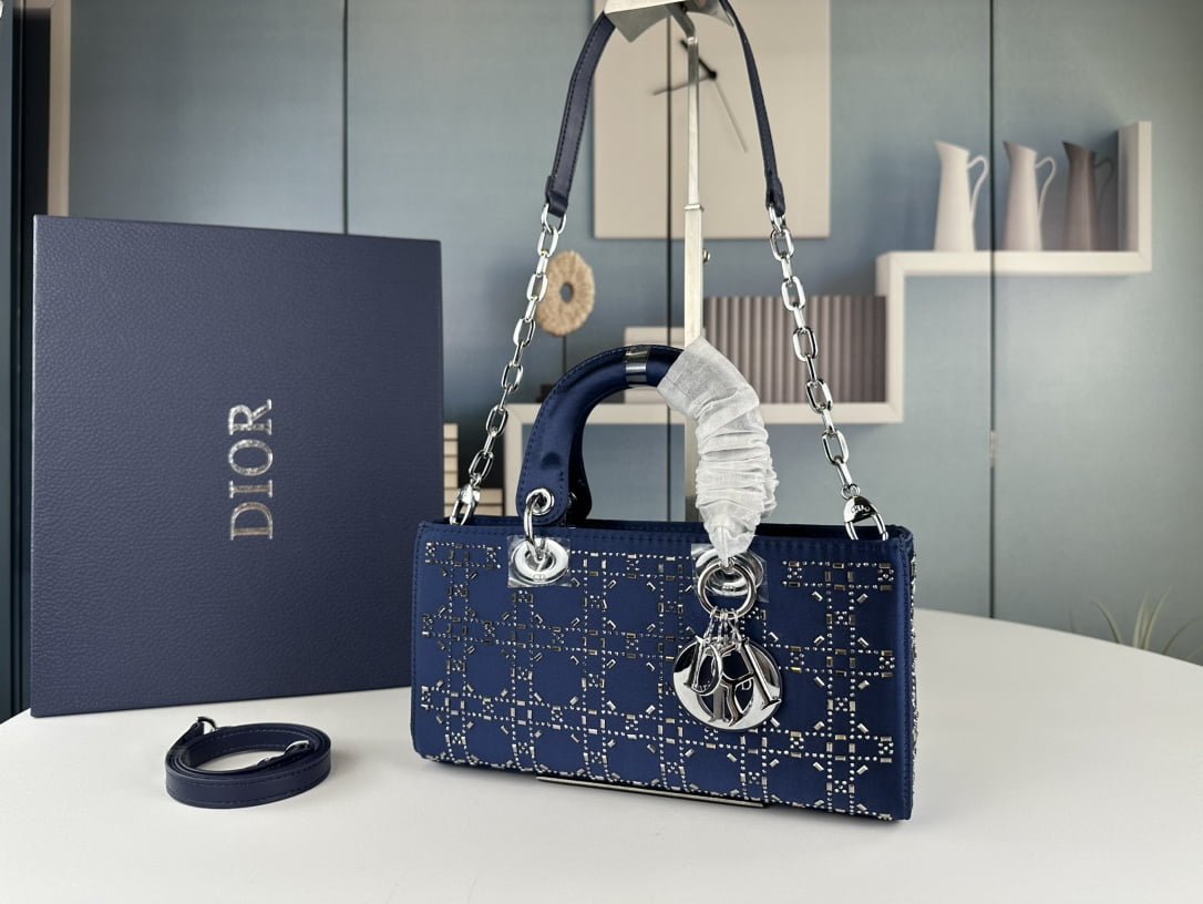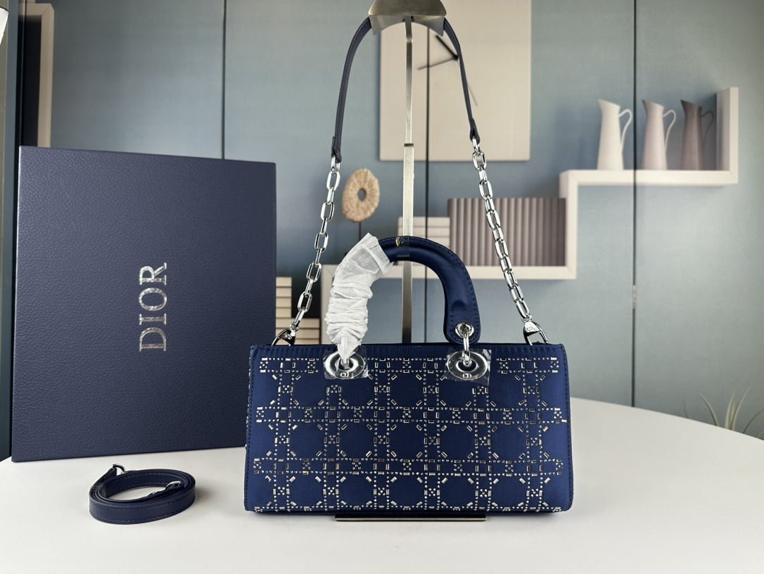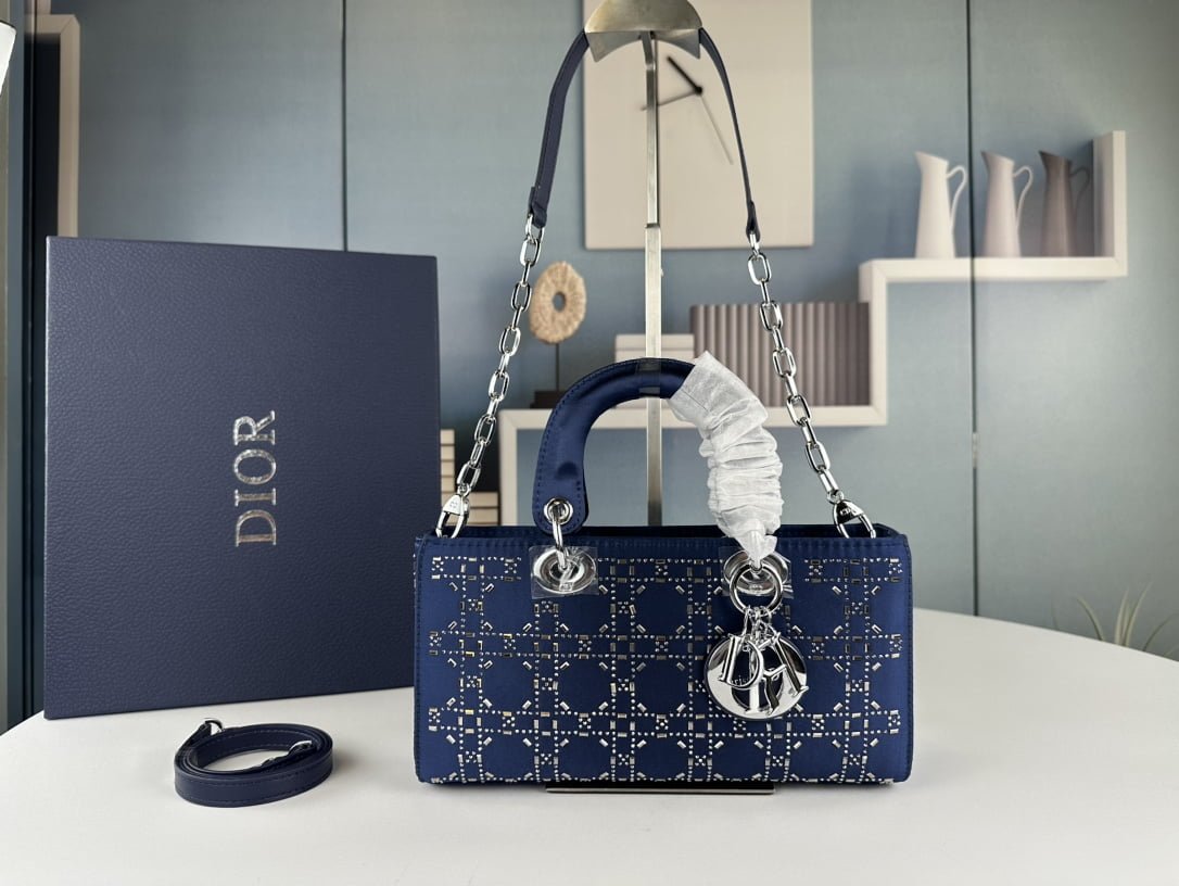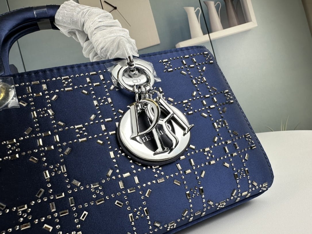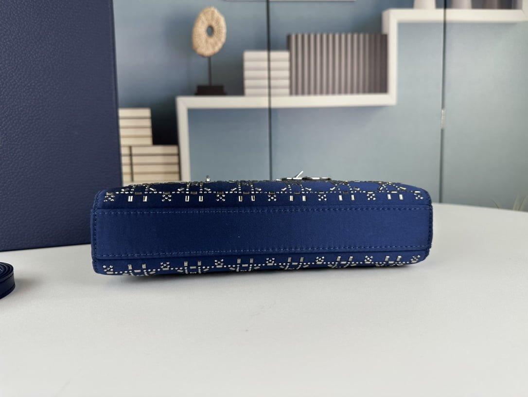 Dior satin diamond-encrusted Princess Diana bag blue 2320 size: 26*13*6cm