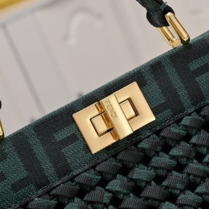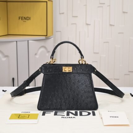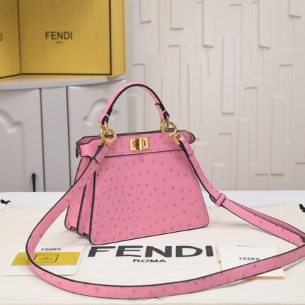 Clamshell magnetic snaps. Equipped with FF magnetic buckle. Lined with zipper bag. With removable shoulder strap, handbag can be shoulder or crossbody. (Sheepskin). Decorated with FF embossed pattern. Gold metal part number F0191
