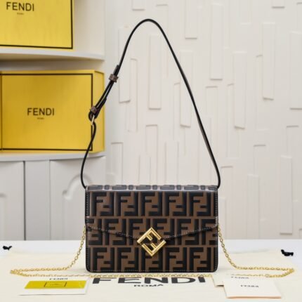 Clamshell magnetic snaps. Equipped with FF magnetic buckle. Lined with zipper bag. With removable shoulder strap, handbag can be shoulder or crossbody. (Sheepskin). Decorated with FF embossed pattern. Gold metal part number F0191