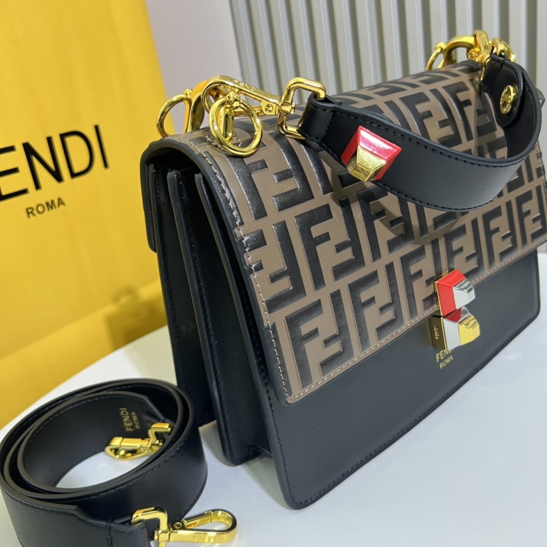 The latest clamshell handbag ???? decorated with the latest fendi logo ????. The magnetic buckle opens and closes. Inside pocket. It comes with a detachable shoulder strap and can be held diagonally or in the hand. Imported calfskin ????. Fully decorated with hand-painted ff embossed logo. Palladium finish mixed with gold finish Metal accessory ???? Model No. 9235 # Size 25.19.11.