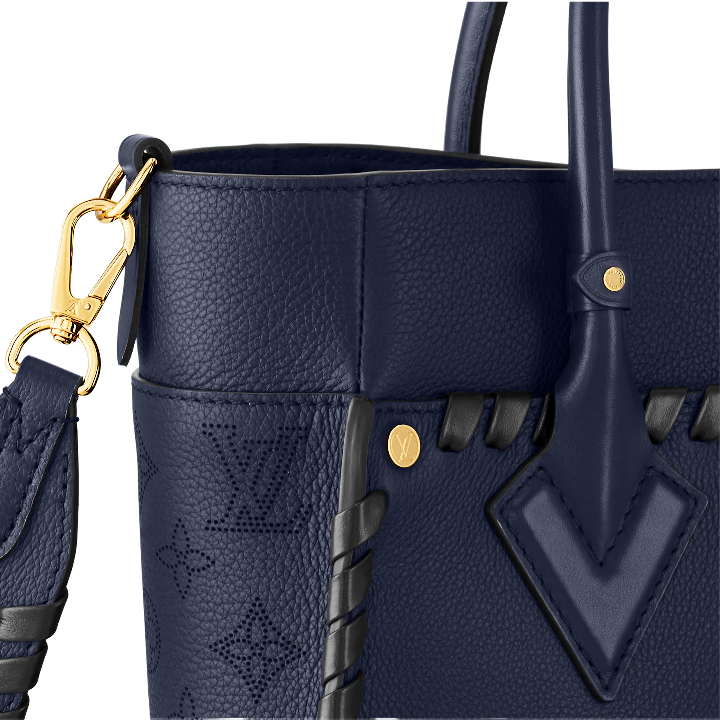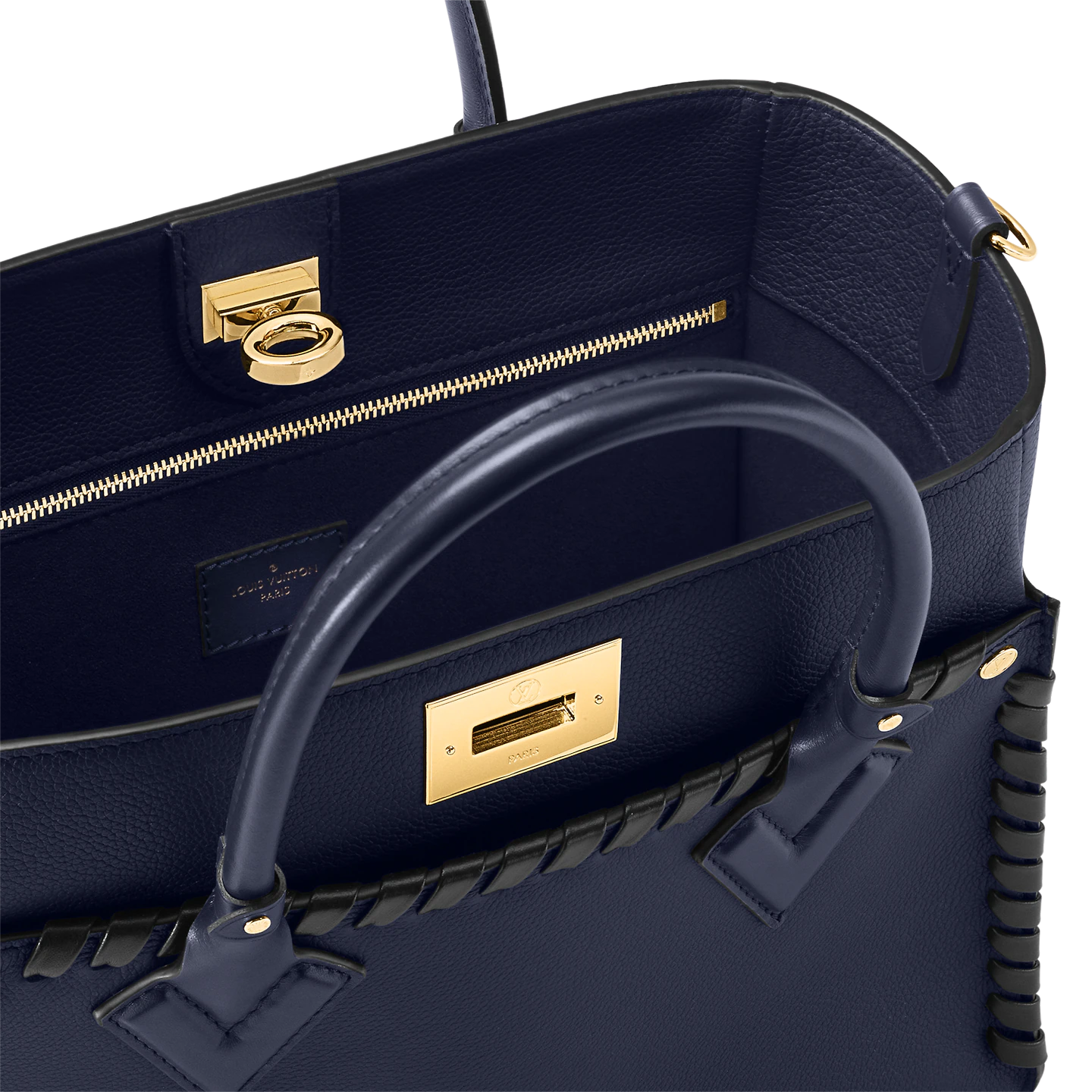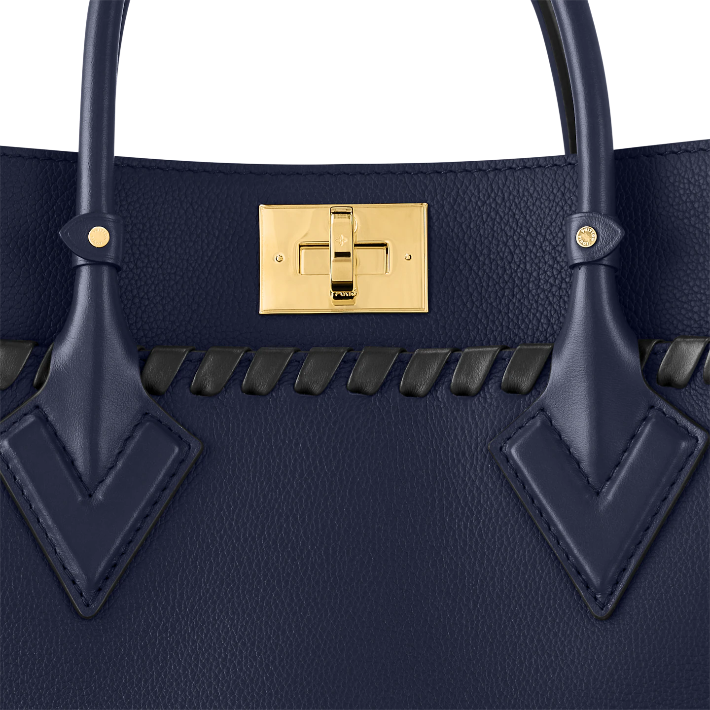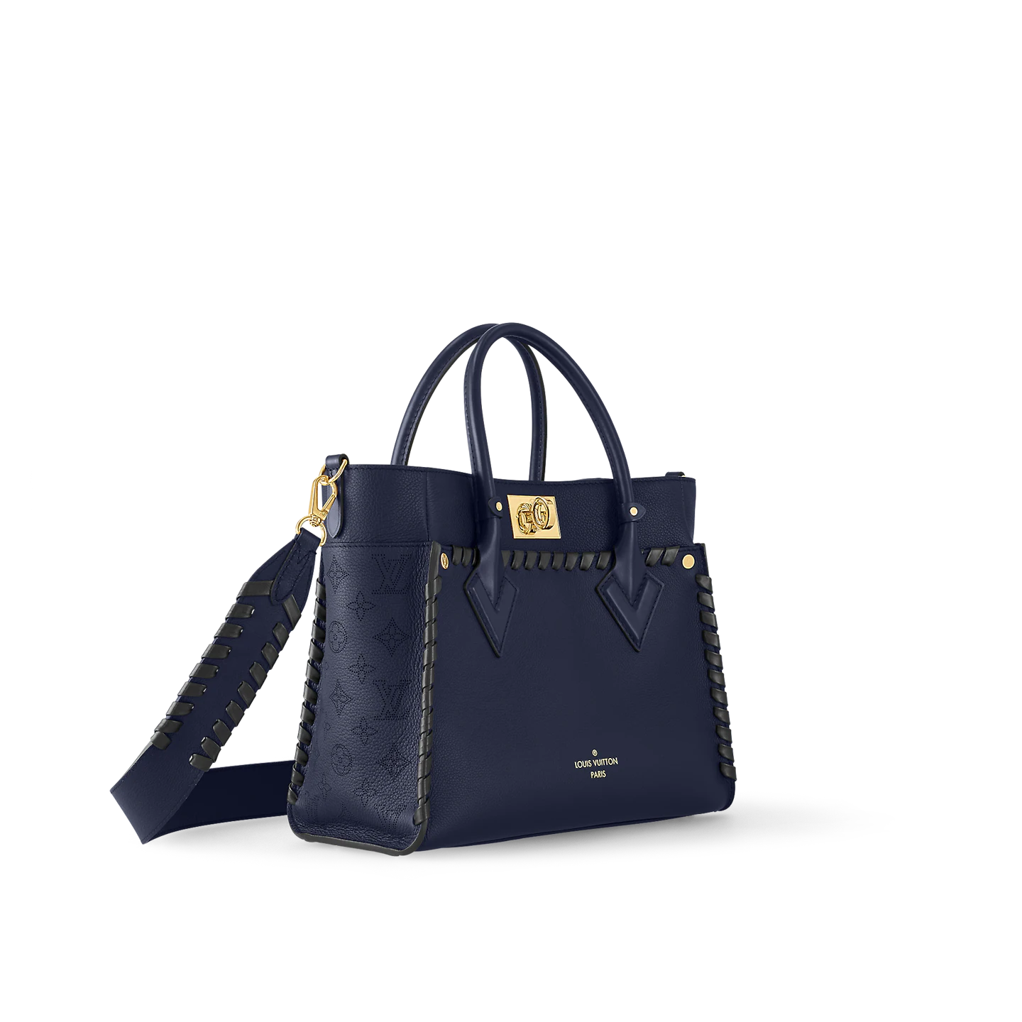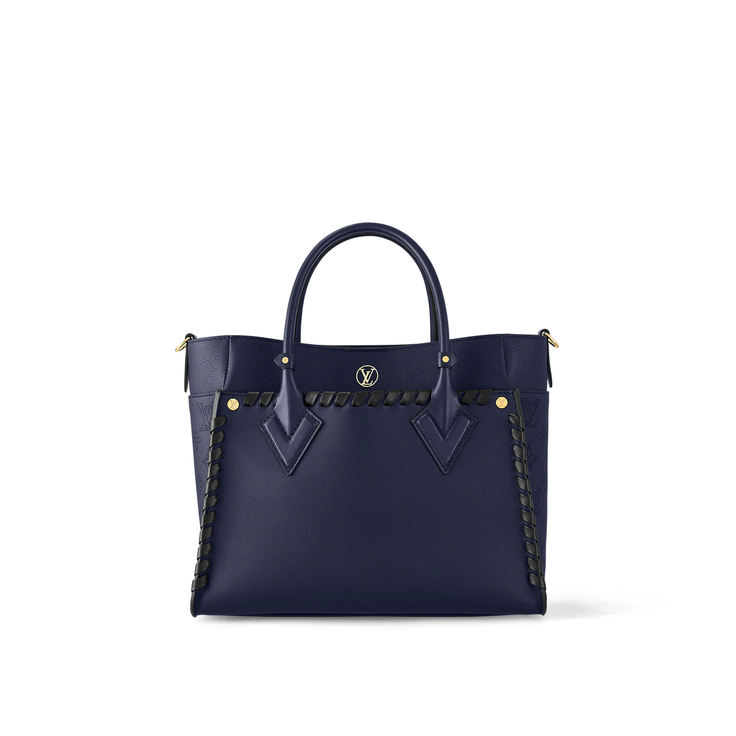 The On My Side MM handbag is made from calf leather. with a perforated Monogram pattern on the sides. Delicate leather braiding. meticulously done by hand. adorns the bag’s front and back. highlighting its structured lines. In addition to the top handles. there’s a wide removable strap. also decorated with braiding.