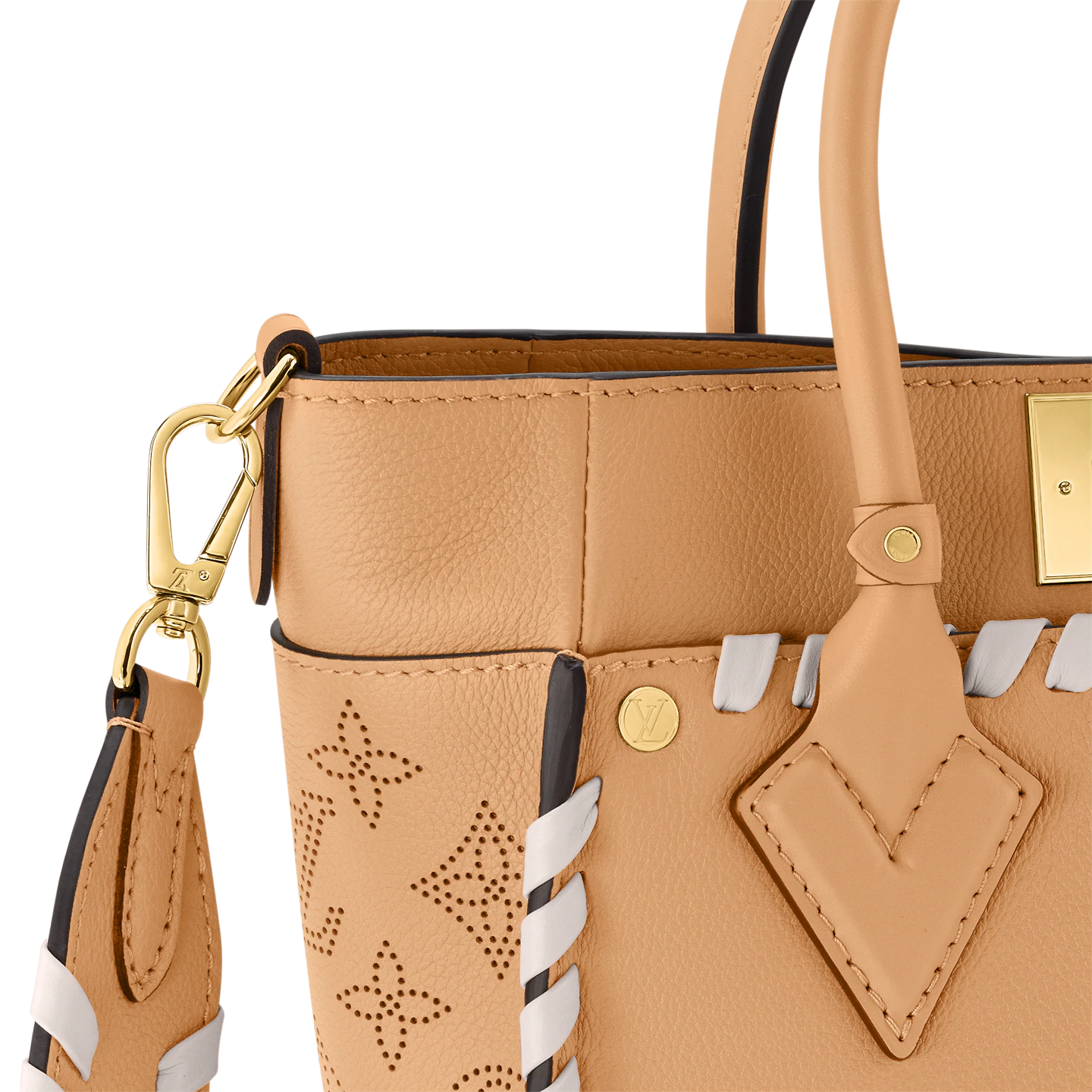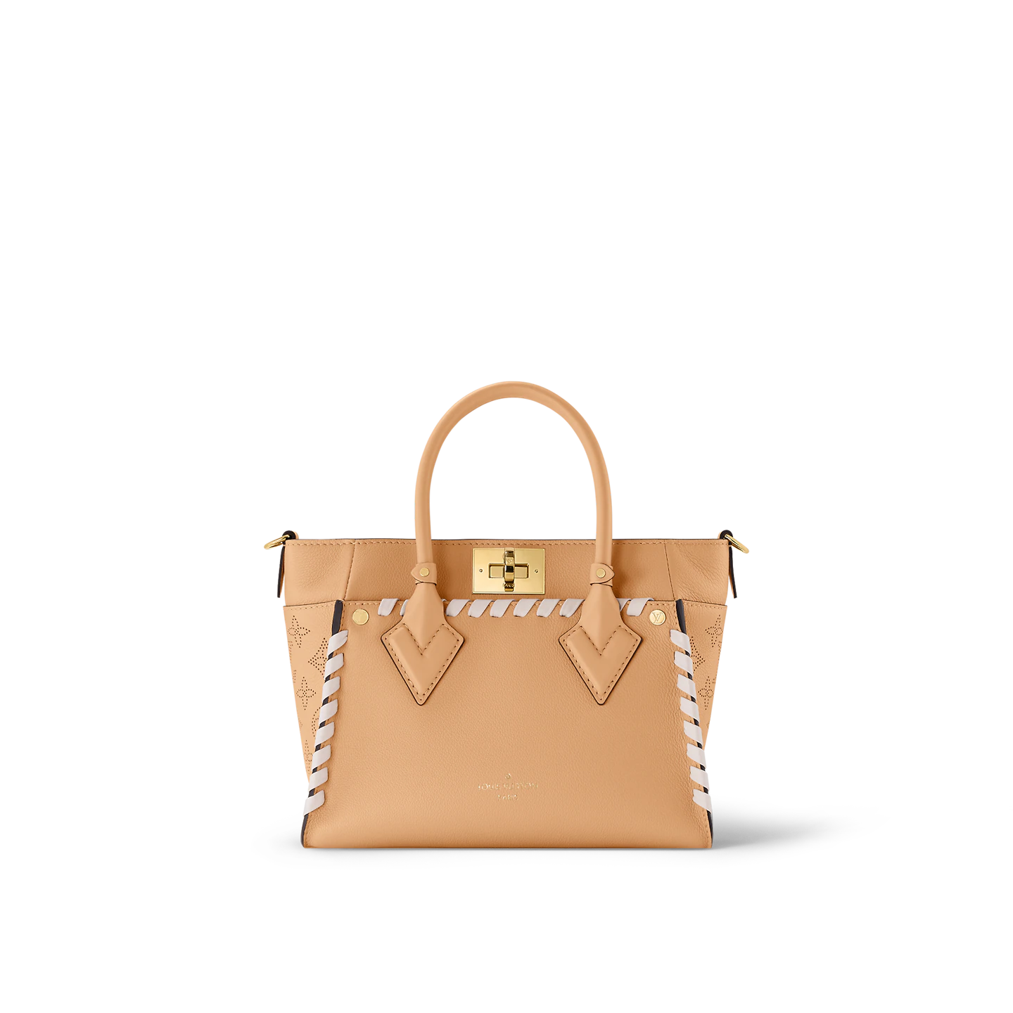 Crafted from supple calf leather. with a perforated pattern of Monogram Flowers and LVs on the sides. this On My Side PM handbag features hand-braided detailing. on the front. back and on the leather strap. Structured enough to wear with business or dress clothes. it brings style to any casual look.