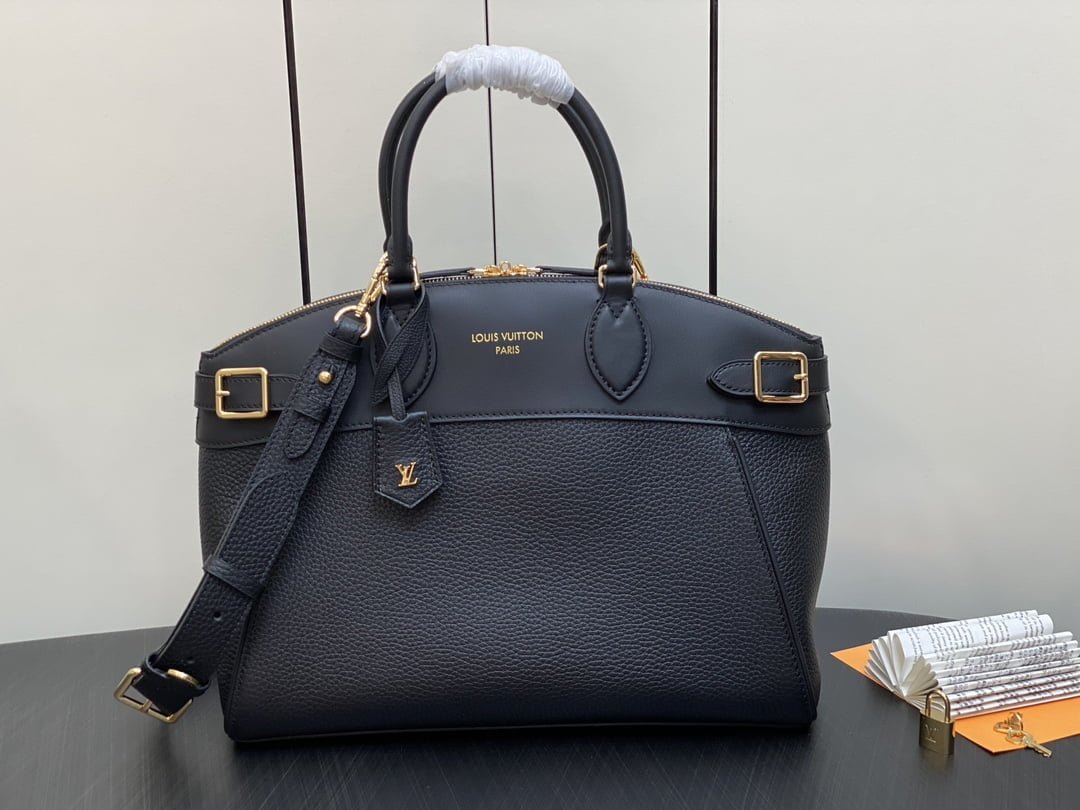 The zys lock it mm Bag m22914 22925 22927 23061 ays lock it mm Bag is a sophisticated and practical combination of grainy taurillon leather and smooth calfskin, complete with gold finish buckle and hardware. Symbolic house decorations include padlocks, key bells and hot-stamped Louis Vuitton signatures. This tote comes with an articulated top handle and a detachable strap, offering a variety of carrying options. Dimensions: 36 x 29 x 15 cm
