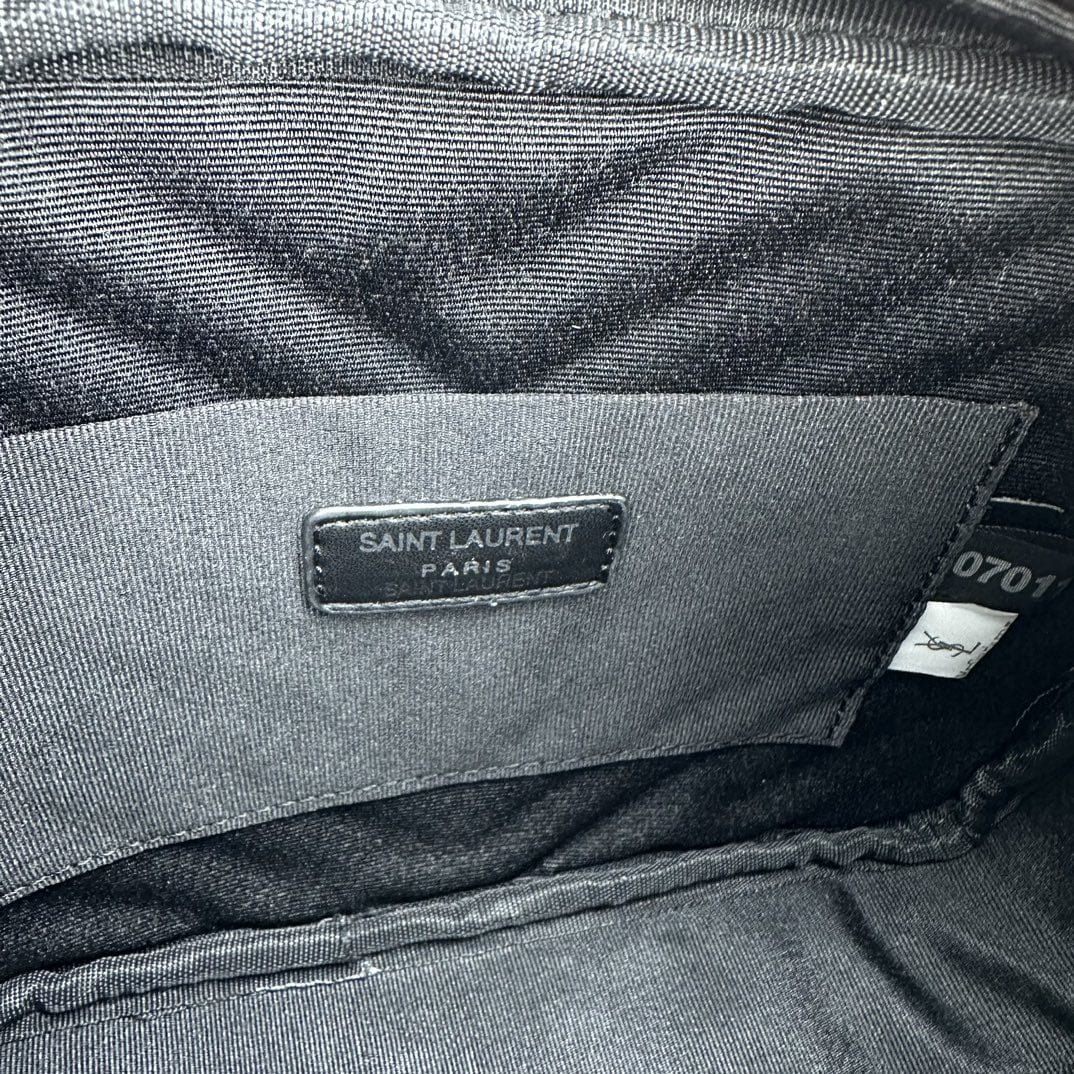 Calfskin forged lining with LAURENT-ENGRAVED metal plaques adorn the zipper. Brush bronze tone metal hardware. Slot pocket shoulder strap vertical: 62 cm